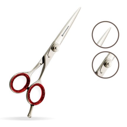 Achieve precise, effortless haircuts with these Professional Barber Scissors, designed for barbers, hairstylists, and salon professionals. Featuring an ergonomic handle with red ring accents, these shears provide a comfortable grip, enhanced control, and superior cutting precision. Made from premium stainless steel, these high-performance hair-cutting shears feature razor-sharp convex blades that glide effortlessly through all hair types. The adjustable tension screw allows customization for different cutting techniques, while the offset handle design reduces wrist strain, making them ideal for long hours of hairstyling.Specifications