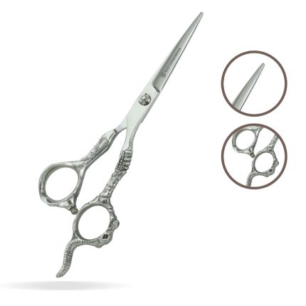 These professional shears feature an intricately engraved dragon handle, offering a bold, artistic look while enhancing grip and balance. The curved ergonomic structure is crafted for professionals seeking both style and functionality. The offset handle promotes a natural hand position, reducing wrist strain and fatigue, making it ideal for prolonged hairstyling sessions.