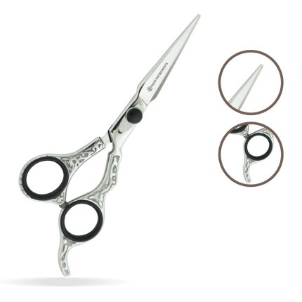 Experience ultimate precision with these professionally designed hair-cutting scissors, featuring an engraved, artistic handle for an elegant and unique look. Made from high-quality stainless steel, these shears provide razor-sharp precision, making them ideal for barbers, hairstylists, and home users. The ergonomic offset design ensures a comfortable grip and reduces wrist strain, allowing for extended use without discomfort. The sharp convex blades offer a smooth, effortless cutting experience, while the adjustable tension screw allows customization based on your cutting needs.Specifications: