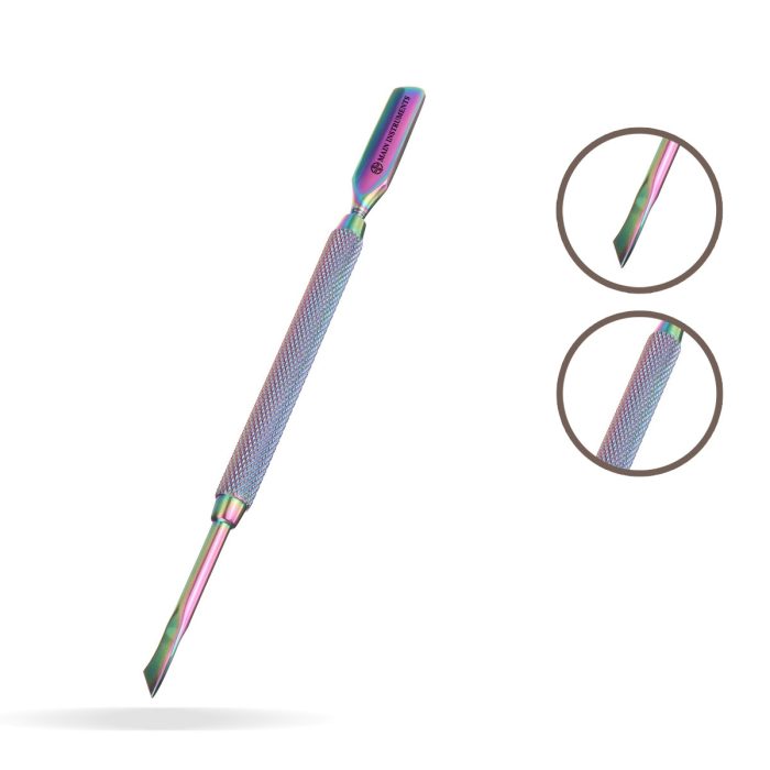 Upgrade your nail care routine with this premium rainbow titanium-coated stainless steel cuticle pusher. Designed for precision and durability, this dual-ended tool features a curved pusher on one end and a flat, angled pusher on the other, making it perfect for pushing back cuticles and removing nail residue. The unique iridescent rainbow finish adds a stylish touch, while the textured, non-slip grip ensures maximum control and ease of use.