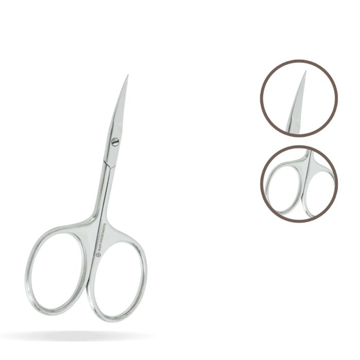 These cuticle scissors feature a compact, ergonomic design with rounded finger loops for a secure grip and precise control. The sharp, straight-edged blades are designed to effortlessly trim cuticles and fine hairs with extreme precision. Their sleek, lightweight stainless steel body ensures durability and a professional manicure experience.
