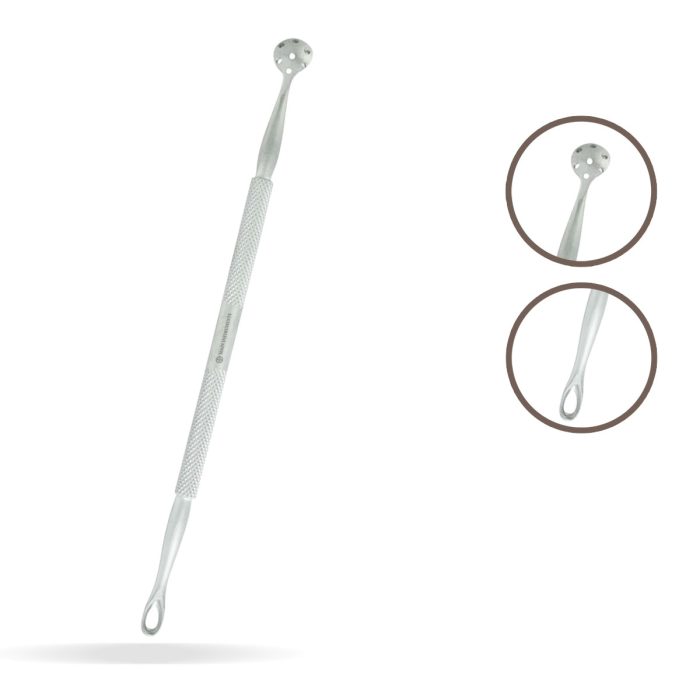 Achieve clear, blemish-free skin with this premium stainless steel comedone extractor, expertly designed for effective removal of blackheads, whiteheads, and pimples. This dual-ended facial tool features a precision loop on one end and a multi-hole suction cup extractor on the other, making it an essential blackhead removal tool for skincare professionals and personal use. The knurled grip handle ensures a secure, non-slip hold, allowing for precise control and minimal skin irritation. Perfect for all skin types, this dermatologist-approved extractor is a must-have for pore cleansing and acne treatment.