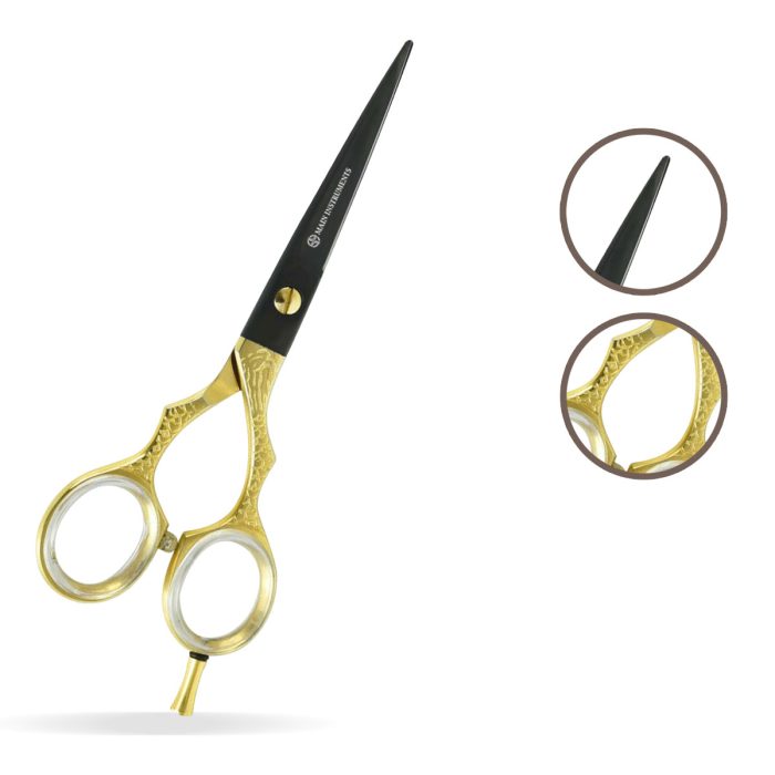 Upgrade your hairstyling experience with these luxurious gold-plated professional hair-cutting scissors, designed for barbers, hairstylists, and salon professionals. Made from high-grade stainless steel with intricate gold-engraved detailing, these premium barber shears combine style, precision, and durability for effortless, salon-quality haircuts. Featuring ultra-sharp convex edge blades, these scissors provide seamless cutting, minimizing hair damage and ensuring smooth, clean results. The ergonomic sculpted handle offers superior comfort and grip, making them perfect for extended use without fatigue.Specifications:
