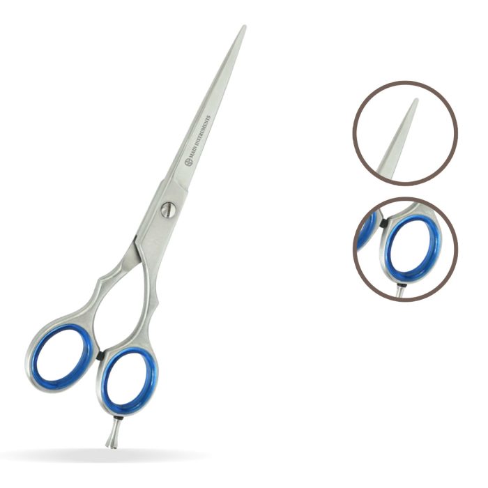 Upgrade your hairstyling tools with these premium professional hair-cutting scissors, designed for barbers, hairstylists, and salon professionals. These scissors are crafted from high-grade stainless steel with a matte silver finish, ensuring durability, precision, and a sleek aesthetic. The ergonomic handle with soft blue ring inserts provides superior comfort and grip, reducing hand fatigue during long cutting sessions.