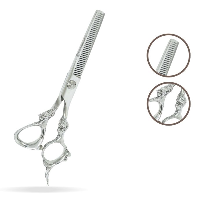 Elevate your hairstyling experience with these luxury dragon-handle thinning scissors, designed for professional barbers, hairstylists, and salon experts. Crafted from high-quality Japanese stainless steel, these scissors feature a razor-sharp thinning blade with 30–40 precision teeth, allowing seamless texturizing and blending. The standout feature is the intricately designed dragon-handle, offering a premium aesthetic and ergonomic grip for maximum control and comfort.