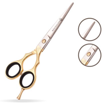 Experience the ultimate blend of elegance, precision, and durability with these luxury professional hair cutting scissors. Designed for barbers, hairstylists, and home users, these high-performance shears feature a striking gold-plated handle with intricate engravings and a sleek black-coated blade for a sophisticated look. The razor-sharp straight-edge blades ensure seamless, precise, and smooth cutting, making them perfect for trimming, layering, and texturizing all hair types. With an ergonomic semi-offset handle, these scissors provide maximum comfort, control, and reduced hand fatigue, making them ideal for extended salon use.Specifications: