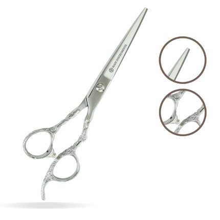 These professional shears feature an intricately engraved dragon handle, offering a bold, artistic look while enhancing grip and balance. The curved ergonomic structure is crafted for professionals seeking both style and functionality. The offset handle promotes a natural hand position, reducing wrist strain and fatigue, making it ideal for prolonged hairstyling sessions.