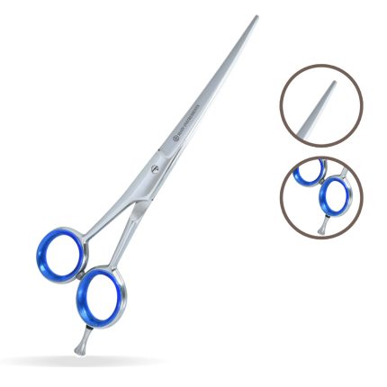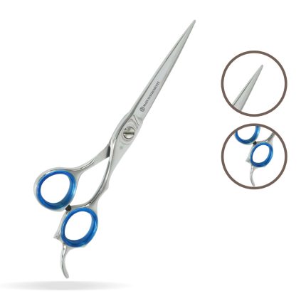 Upgrade your hair-cutting experience with these high-quality stainless steel hair scissors, designed for barbers, hairstylists, and home use. These professional shears feature razor-sharp convex blades that deliver precise and effortless cutting, making them ideal for all hair types. The ergonomic design ensures maximum comfort, reducing hand fatigue during extended use. With a sleek silver finish and blue soft rubberized finger inserts, these scissors provide a comfortable grip and superior control, allowing for precise hair trimming, layering, and texturizing. The offset handle and removable finger rest enhance stability, making them perfect for professionals and beginners alike.Specifications: