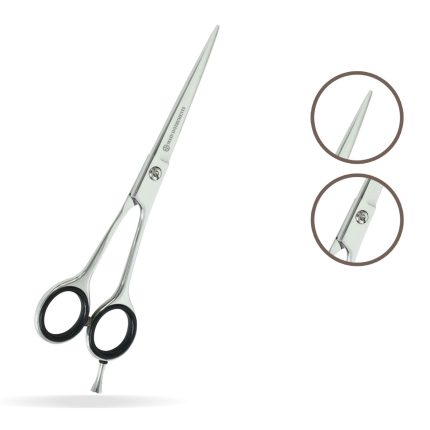 Achieve precision haircuts with these high-quality professional hair-cutting scissors, designed for barbers, hairstylists, and home users. Made from premium stainless steel, these scissors ensure long-lasting durability, superior sharpness, and effortless cutting. The sleek mirror-polished finish gives them a professional look, making them a must-have for any salon or personal grooming kit. The razor-sharp straight-edged blades offer seamless, precise cutting, making them ideal for trimming, layering, and texturizing all hair types. The ergonomic handle with black rubber ring inserts provides extra comfort, ensuring a firm grip and reduced strain on fingers and wrists.Specifications:
