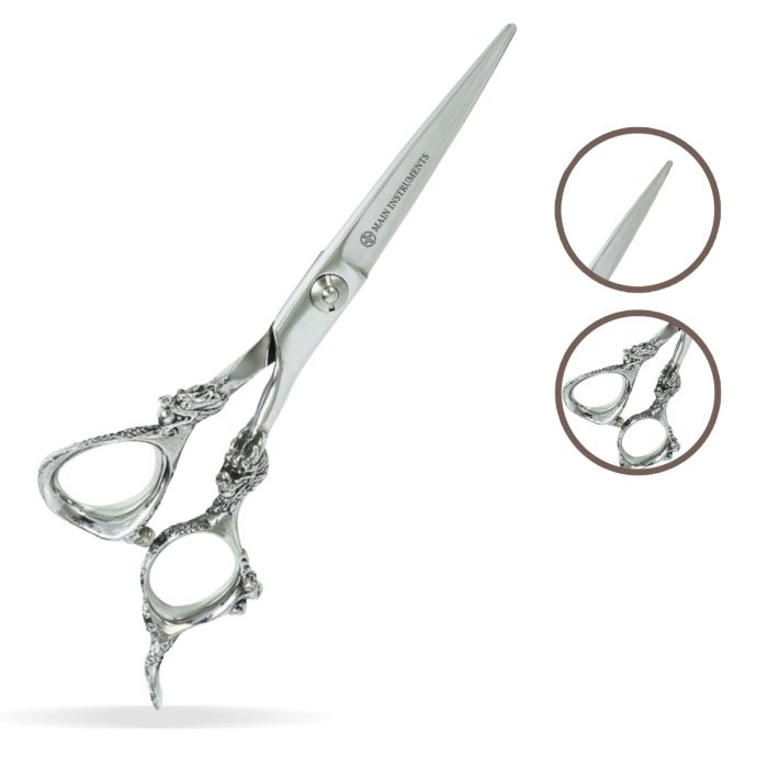 These professional shears feature an intricately engraved dragon handle, offering a bold, artistic look while enhancing grip and balance. The curved ergonomic structure is crafted for professionals seeking both style and functionality. The offset handle promotes a natural hand position, reducing wrist strain and fatigue, making it ideal for prolonged hairstyling sessions.