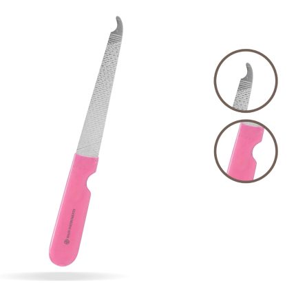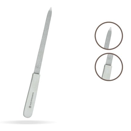This stainless steel nail file features a slim, tapered design that provides precision and control. The textured filing surface allows for quick and effortless shaping, while the pointed tip makes it easy to clean under nails and refine edges. The ergonomic plastic handle ensures a comfortable grip, reducing hand strain during extended use.