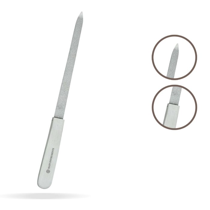 Get perfectly shaped and polished nails with this high-quality stainless steel nail file, designed for professional and home nail care. Featuring a durable double-sided textured filing surface, this slim, pointed metal nail filer effectively smooths and shapes natural, acrylic, and gel nails. The sleek stainless steel handle ensures a secure grip, providing precision and control for effortless filing.
